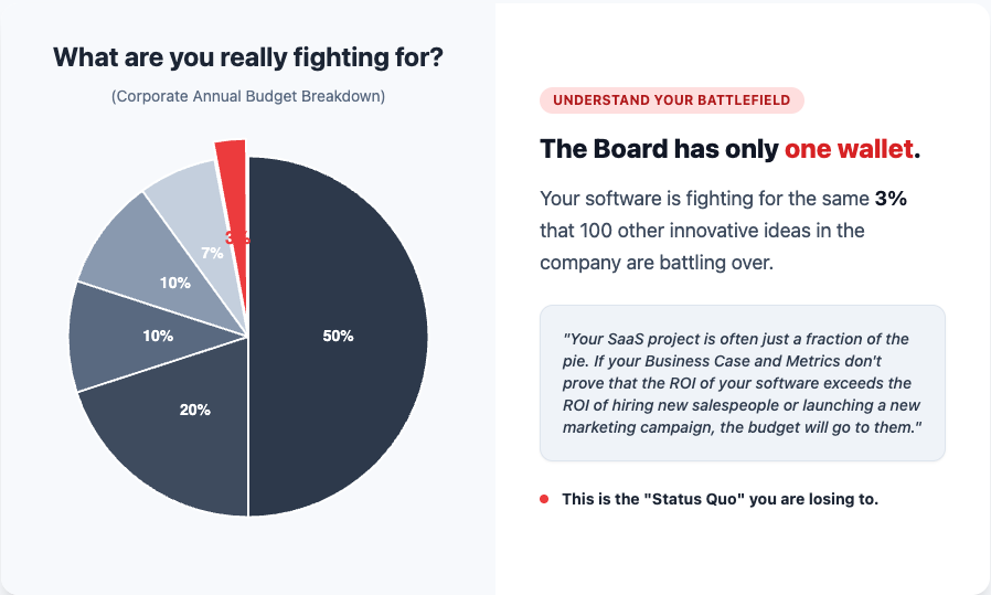 The CFO or CEO has one budget, and in that very same second, 100 other projects are fighting for it – from a new HR system, through a fleet vehicle replacement, to a gigantic marketing campaign. When your deal loses and ends in “no decision” (status quo), it simply means you failed to build and prove a value large enough to defeat those 99 other projects on the priority list. The Pain you solve turned out to be insufficiently strong on an organization-wide scale.